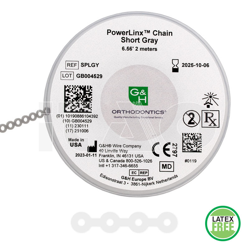 Le catenelle PowerLinx™ sono realizzate da G&H® Orthodontics con un’unica miscel di polimeri termoindurenti.