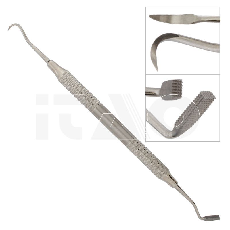 • Dotato di una estremità zigrinata per adattare le bande e una tagliente per rimuovere eccessi di cemento o adesivo